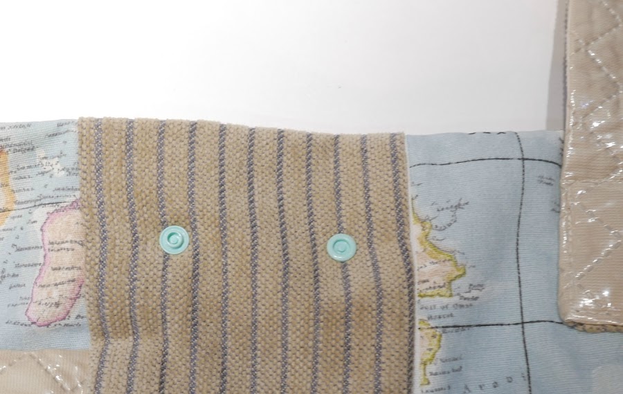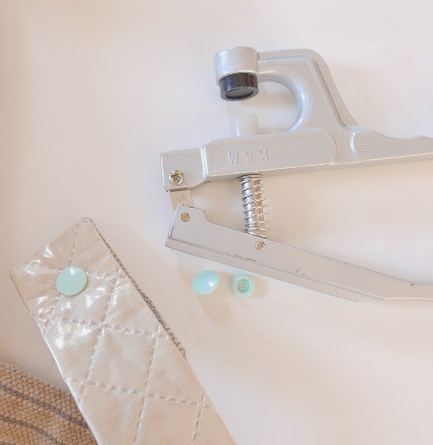 Ya sólo nos faltarán los snaps que se colocan en las piezas laterales. Se ponen desde la parte interior. Así cuando se abrochan, queda el lateral plegado.