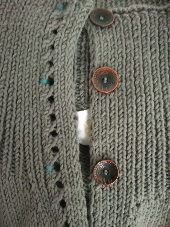 Modificaciones: He tejido la talla XL, me resistí a la tentación de tejerla un poco más larga que en el patrón original y fue un acierto, porque se estiró bastante con el bloqueo. He puesto una marca en los ojales en uso para no confundirme al abrocharla, y he hecho nudos en el reverso de cada marca para poder encontrar los ojales fácilmente.