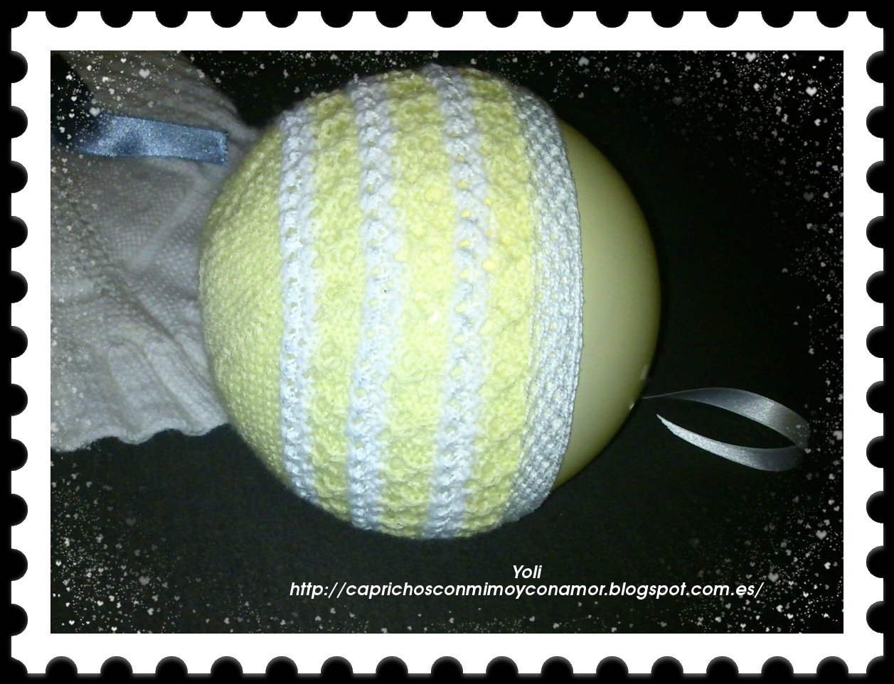 Como ahora no tengo compromisos por el momento hasta septiembre la cogí y la di el último tirón para terminarla, el lazo es un retal que me regalo la chica de la mercería, porque al no saber a que dueñ@ sera destinada me venia bien cualquier color jejeje.