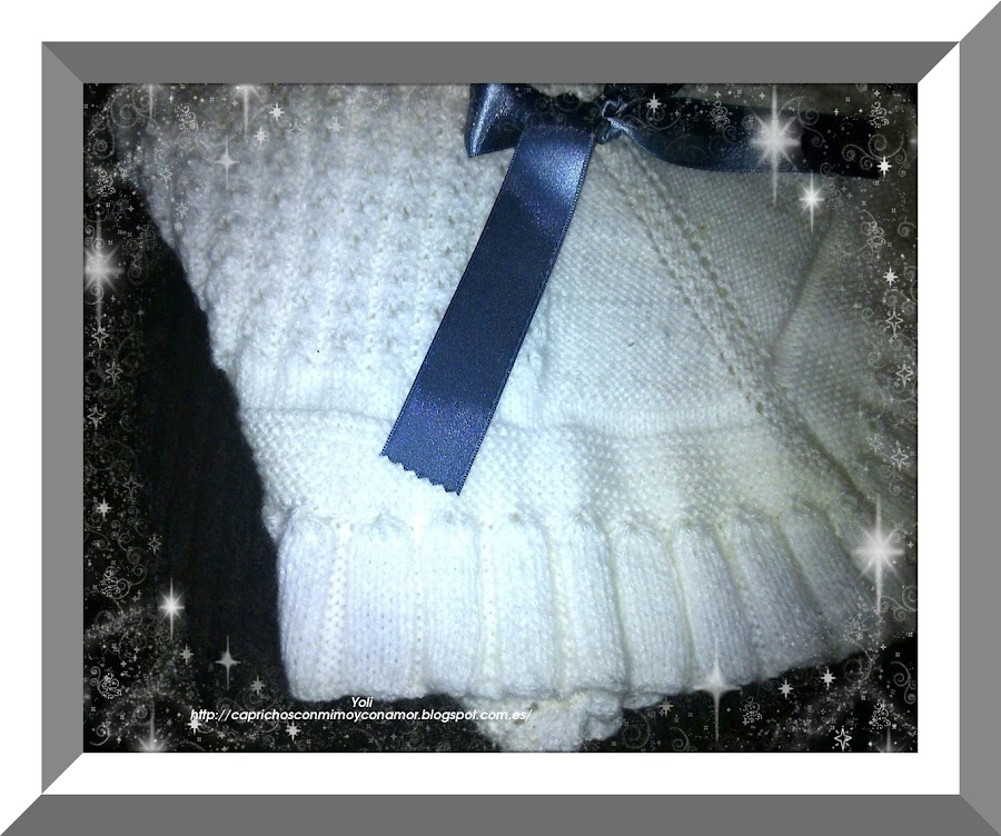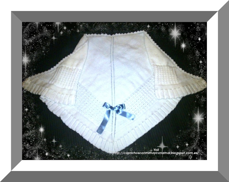 La toquilla llevaba comenzada desde el pasado verano..la parte central de punto musgo la tejió ella , como en la gris caricia que ya os presente..la verdad que ayuda un poco jjjjji
