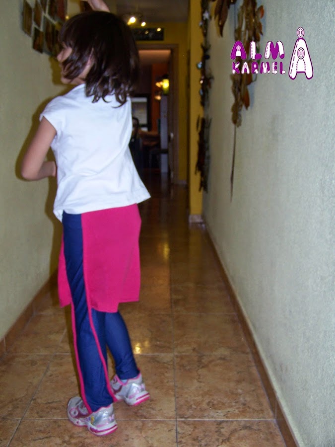 La tela de los pantalones es Tela Jeggins, tela muy finita, con caída y estupenda para el tiempo en que no hace mucho frío, pero pide un pantalón largo , y la de la falda es una camiseta grande reciclada.
