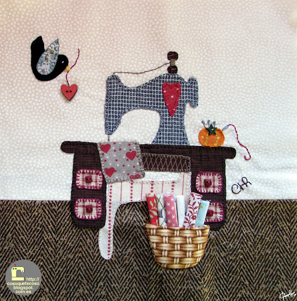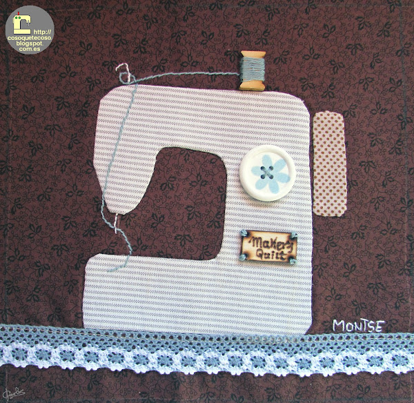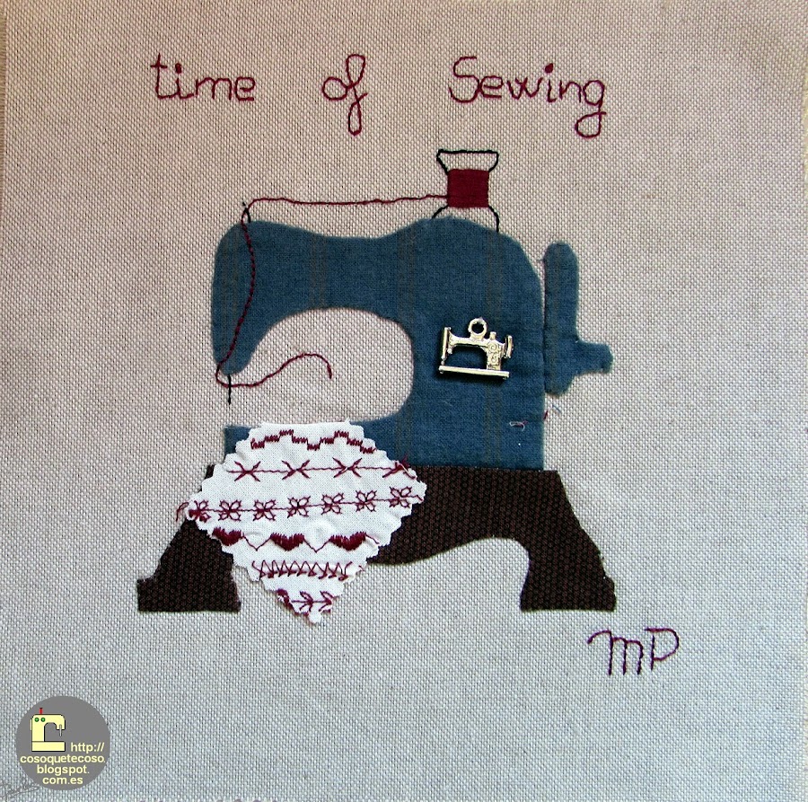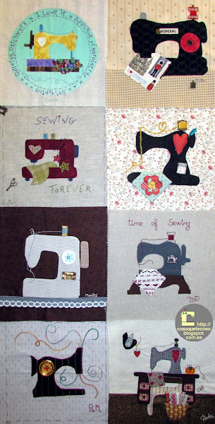 El cuarto, de Isabel, que ha tenido el detalle de copiar mi logo y los colores. También podéis observar que la máquina está a la derecha, hasta ahora al revés que el resto, tal como está en mi blog. Divino. El bloque se llama CosoQueTeCoso.