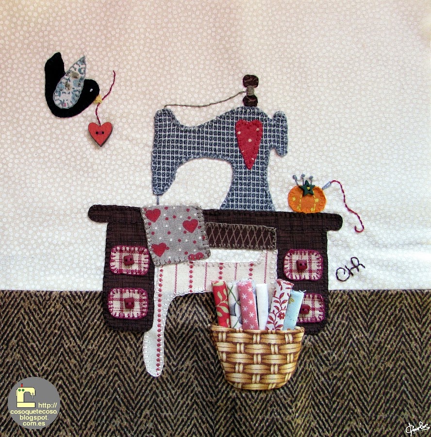 Fijaos en el mueble, en su acerico de calabaza, los cajoncitos con sus pomos, la cesta con las telas, el pájaro revoloteando, vaya currada!!! Preciosísimo.