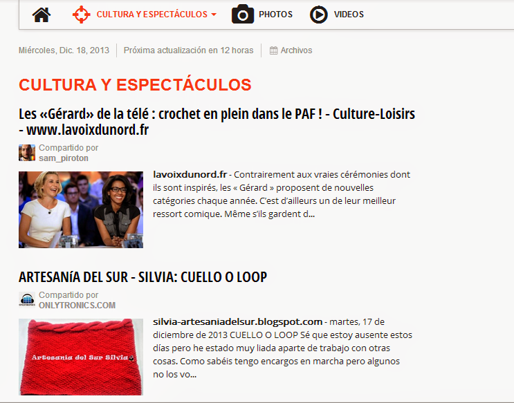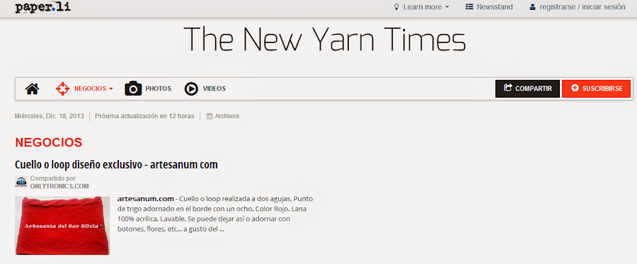 The New Yarn Times, de publicación internacional, me ha hecho un huequito publicando sobre el Cuello rojo que publiqué ayer, en el apartado "Cultura y Espectáculos" aparece mi blog, y en el apartado "Negocios" aparece mi tienda en artesanum.