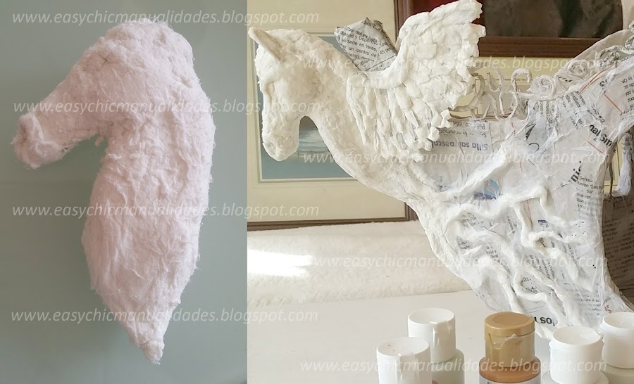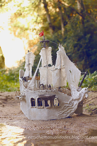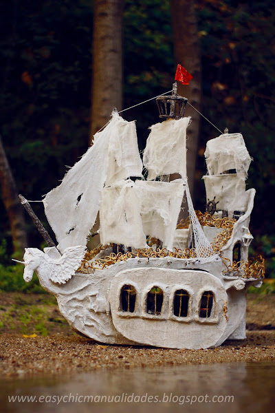 Para crear una textura rugosa en la superficie del barco y así darle un aspecto más fantasioso utilicé papel de seda aplicado con cola blanca y agua y dejando que forme esas arrugas. El papel de seda lo podéis comprar o podéis usar el que viene en las cajas de zapatos. La opción de reciclar siempre sabe mejor.