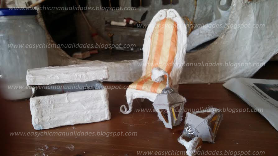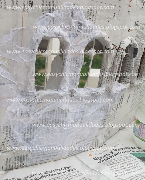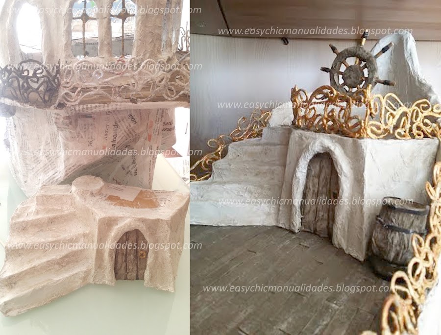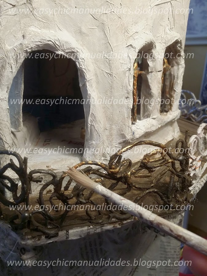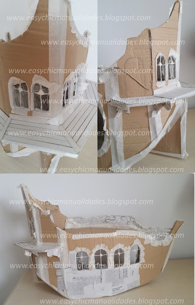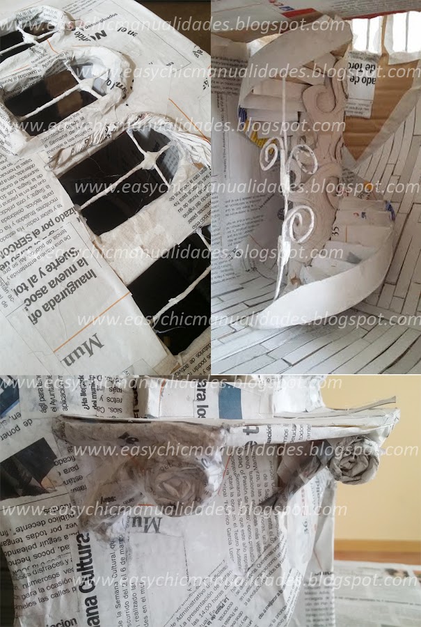 Continué forrando todo el cartón (excepto el suelo de "madera") con papel de periodico aplicando la conocida técnica de la cartapesta. Para realizar las molduras del barco en ventanas o columnas que sujetan el balcón, utilicé rulos de papel de periódico.
