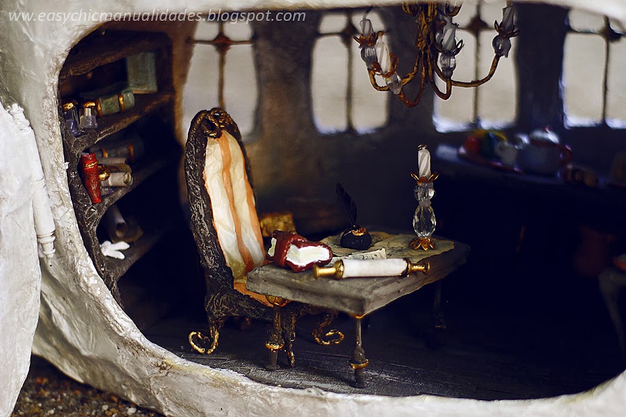 El mobiliario del barco se ha realizado siguiendo una técnica muy parecida al mismo empleando cartones, papel de periodico, papel higiénico, alambre o tela pero también se ha usado algunos abalorios y pasta de modelar casera para crear los libros por ejemplo (Si quieres conocer la receta de la pasta de modelar casera entra aquí)