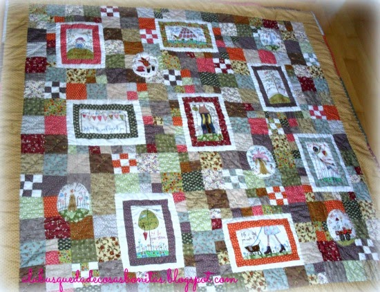 Lo empecé en agosto del 2014, porque era la típica labor perfecta para llevarse de vacaciones, pues iba haciendo los cuadros con las aplicaciones poco a poco, y sólo necesitaba mi caja de los hilos y los retalitos.