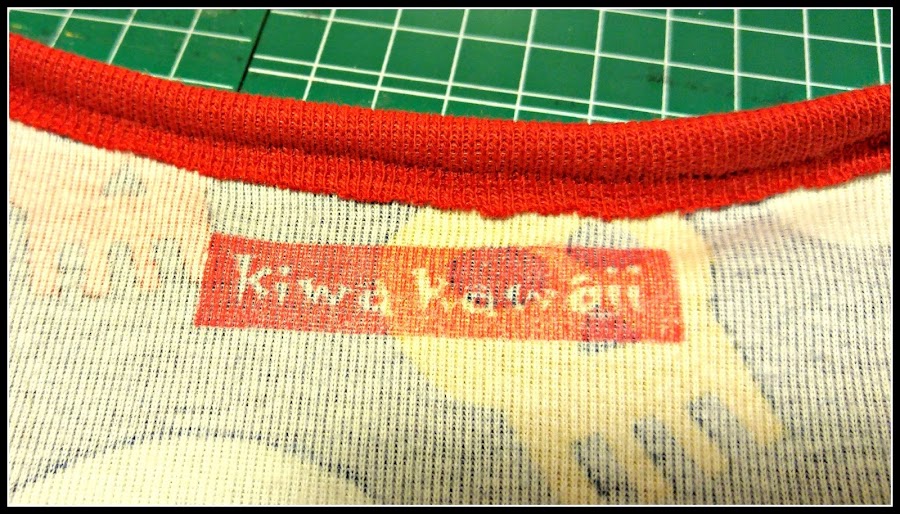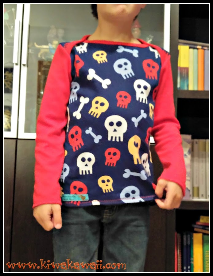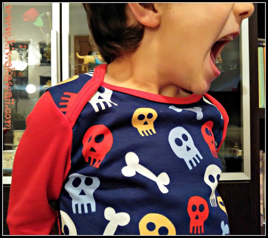 El tejido es punto interlock, por lo que es suavita y cálida, perfecta para el otoño! He hecho dobladillo simple en las bocamangas en vez de ribete, y una costura decorativa en el bajo, donde también he añadido una etiqueta la mar de mona con un dinosaurio simpático.