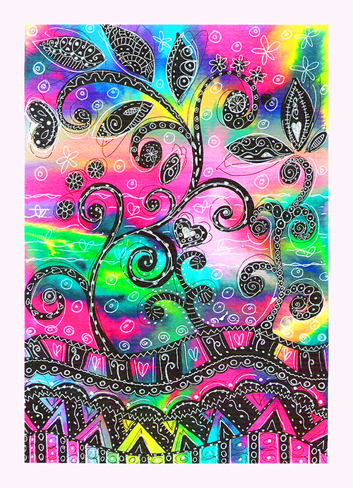 We have been working on watercolour paper. We started soaking the paper with water and, right away, we made blobs of liquid watercolour in different colours, letting it had spread and the mould will indiscriminately. When we already had the base dry, with thick black marker, we have drawn the doodle, we have given some hints with black marker fine tip and we are done drawing the details with white marker.