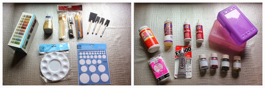 Mod Podge (sellador, cola y terminación con base de agua), Fabric Fusion (adhesivo permanente para tejidos), No Sew Fabric glue (adhesivos momentáneos para tejidos), cajas de almacenamiento, HeatnBond Hem (adhesivo de activación con plancha), E6000 (adhesivo de resistencia industrial), purpurinas Martha Stewart (plata esterlina, turmalina, palo dulce negro y oro florentino)