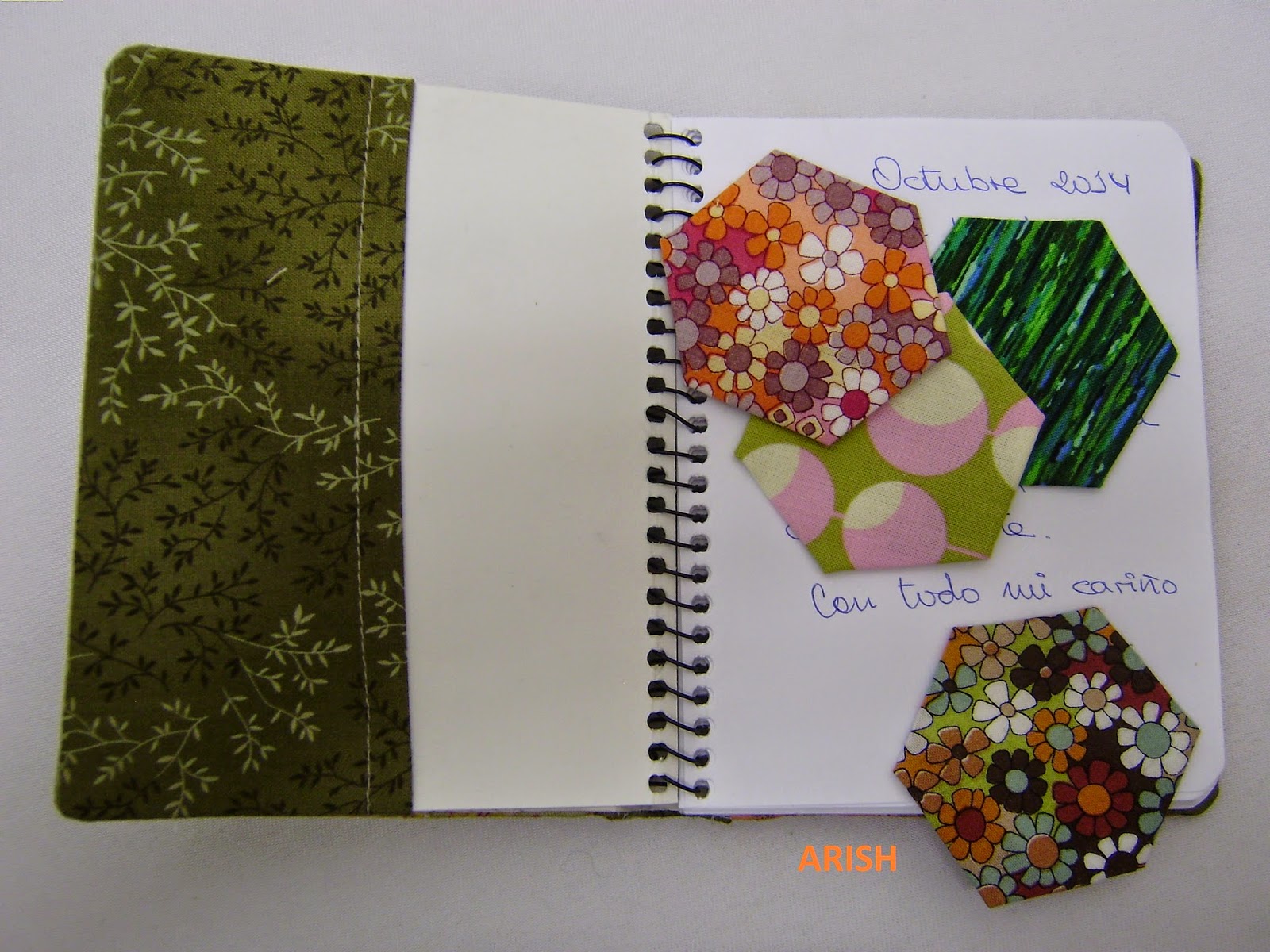 ella sabe que me encanta la técnica del crazy y mirar qué bonita sorpresa me ha dado, es una libreta para anotar proyectos y ??????????????? muchas cosas, las telas que ha empleado me encantan, llevan tonos verdes (que es mi color) y tonos anaranjados (que es su color) y valoro especialmente el tiempo que ha dedicado a hacerla ya que precisamente ahora su casa y su vida están patas arriba y los trabajos hechos a mano requieren muuuuuucho tiempo y no sólo hay que valorar el tiempo empleado y los materiales cuidadosamente elegidos, sino el hecho de pensar en mí mientras lo ha estado preparando y cosiendo