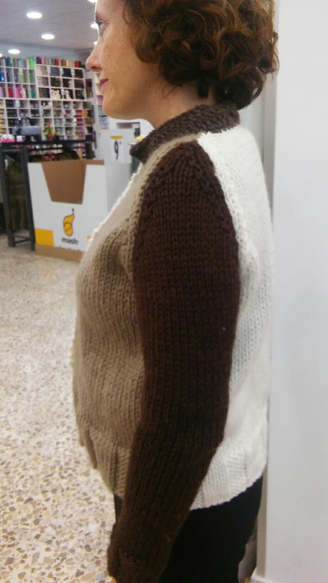 Fácil y rápida ya que está realizada a punto jersey y a punto elástico en el bajo y el empiece de las mangas. El delantero también es a punto jersey pero una parte la puse al derecho y la otra del revés y si observáis bien las mangas son ranglas.