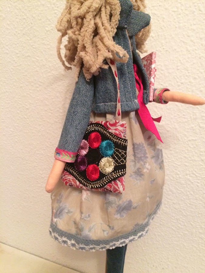 Cazadora vaquera, un bolso muy colorido y un para de libros en la mano.