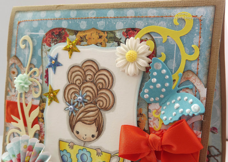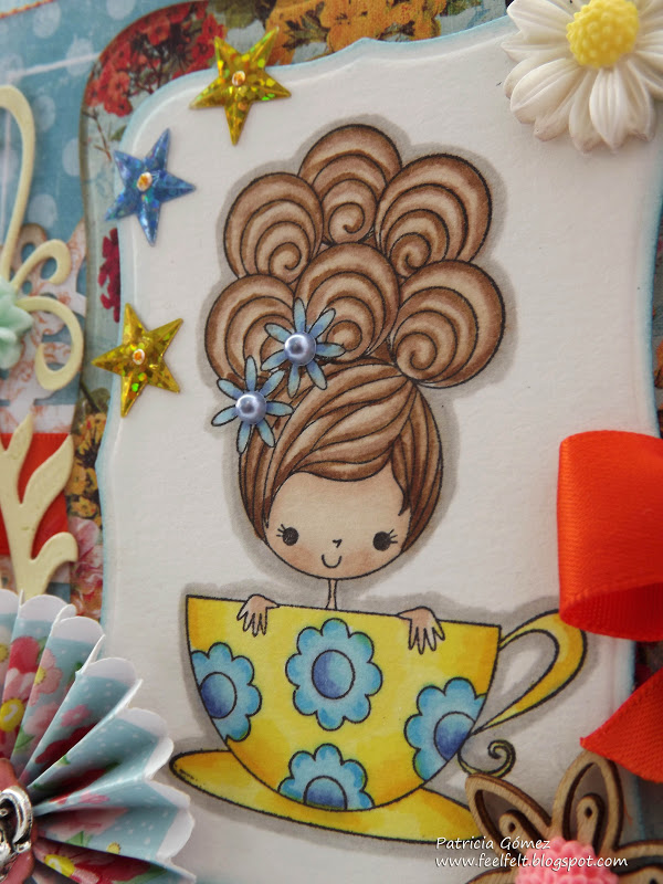 La niña usada es Tilly the Teacup STAMPING BELLA (gracias Sandra!) coloreada con promarkers. La margarita y otros adornos de resina usados han sido cortesía de Paula.
