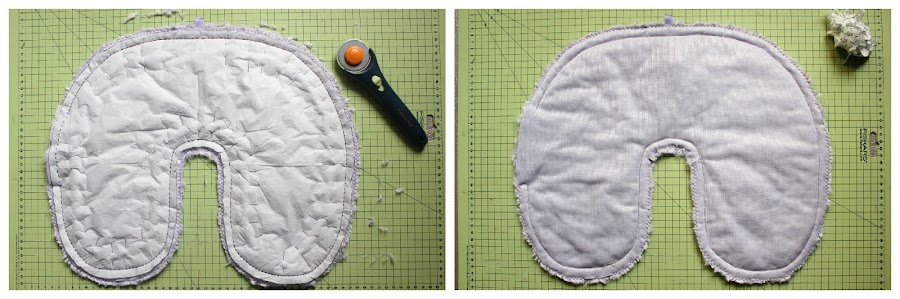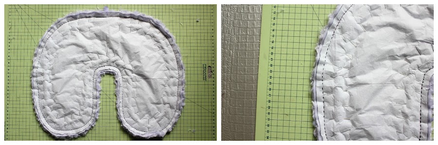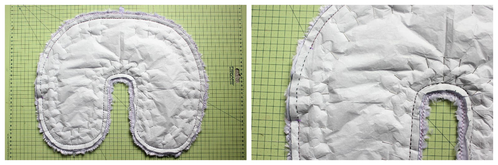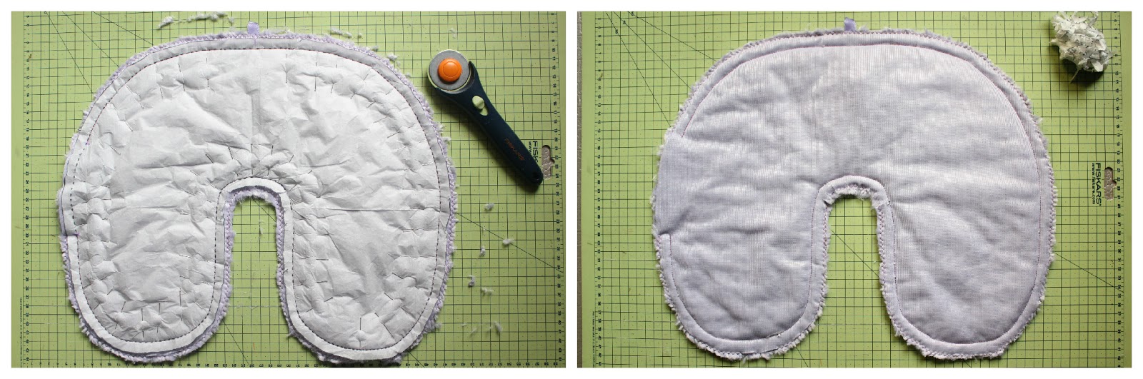 ? Con el cúter rotatorio o unas tijeras cortamos lo que sobra del la tela minky y quitamos el papel de seda.
