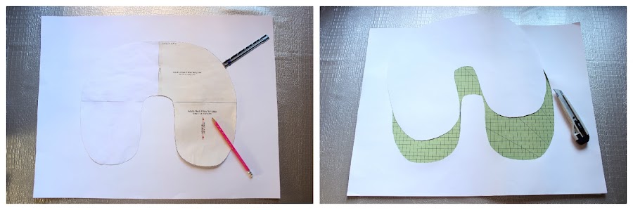 Lo primero que hice fue preparar un nuevo patrón, 1/2 pulgada (1,3 cm) más grande que el original. Para ello he necesitado el patrón original (cada página impresa por dos, cortadas y pegadas formando el patrón) una cartulina, un lápiz y una regla.