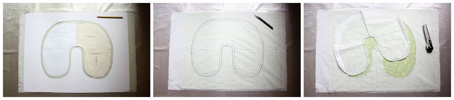 ? Cortamos con un cúter sobre la línea exterior. Tenemos un nuevo patrón de papel de seda, con una línea en discontinuo sobre la cual vamos a coser más tarde.