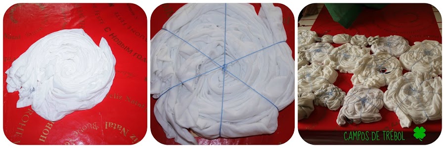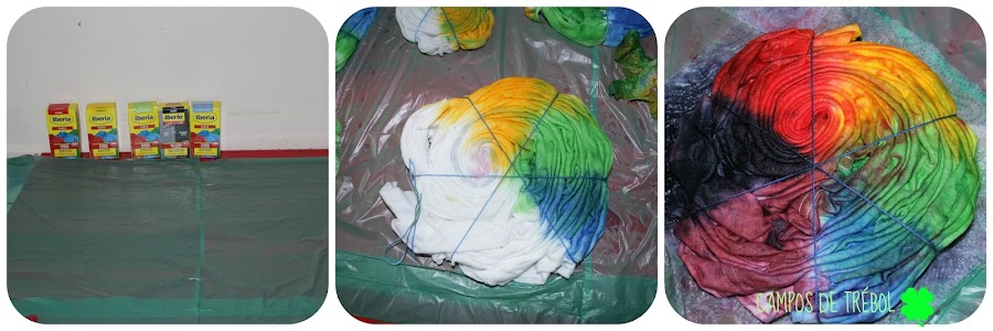 Empezamos humedeciendo las camisetas en un barreño con agua caliente (las instrucciones de los tintes son claros con la temperatura del agua) escurriendo el exceso de agua.