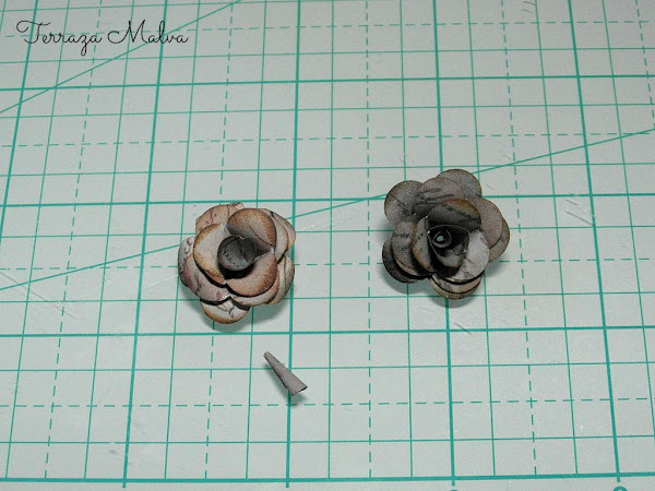 Por último sólo queda ir dando un poco de pegamento en la base de las capas e ir superponiendo unas sobre otras colocándolas de mayor a menor. En la flor izquierda de la foto superior he superpuesto dos capas y en la derecha ya hay tres capas pegadas.