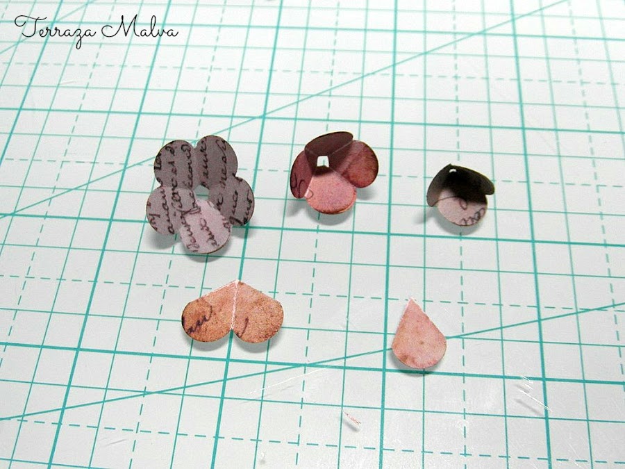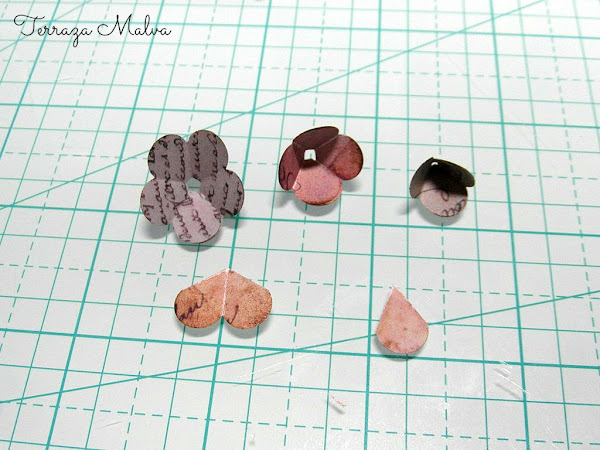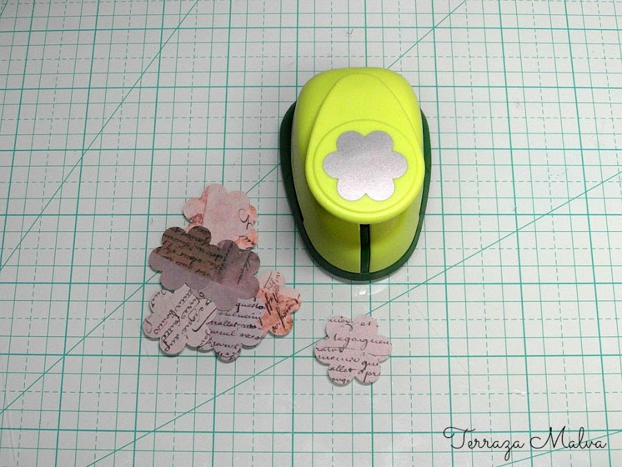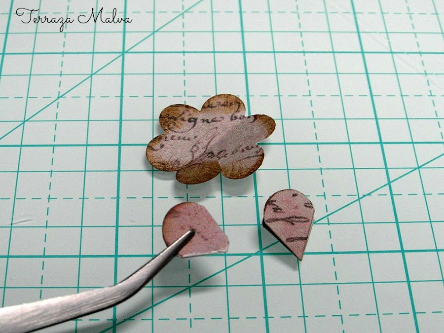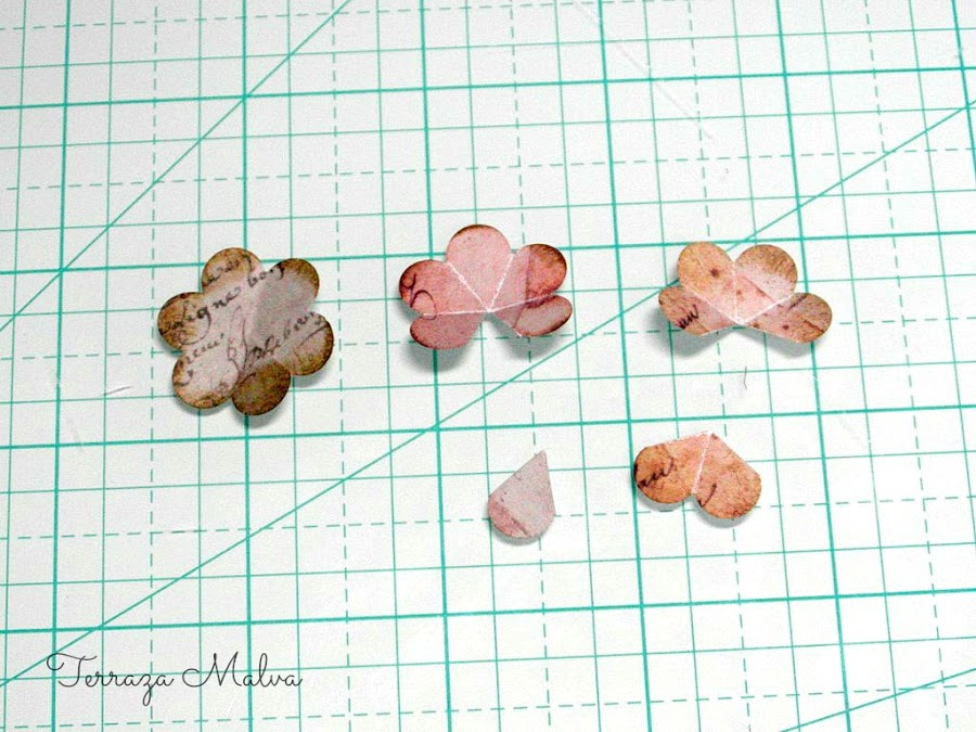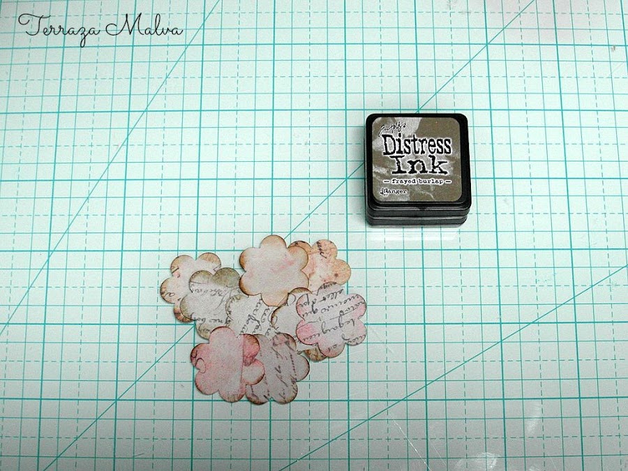El papel que he usado está impreso por las dos caras utilizando una imagen de escritura antigua que encontré en Internet. Después de troquelar varias flores entinté suavemente los bordes para acentuar el aspecto antiguo. Para ello he usado distress ink en color "Frayed Burlap".