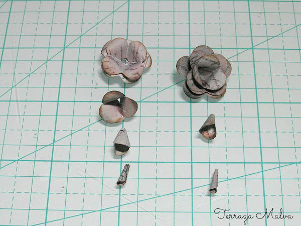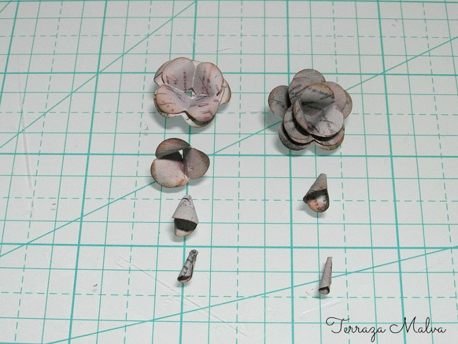 Para cada flor se necesitan tres troquelados. Se doblan de forma que se marquen los "pétalos" de la flor. Después en el primer troquelado se corta sólo una línea desde un borde hasta el centro. En el segundo troquelado se corta un pétalo completo (dos líneas consecutivas desde el borde hasta el centro). Y en el tercer troquelado se cortan dos pétalos juntos. Los pétalos cortados se conservan, pues también se van a utilizar.
