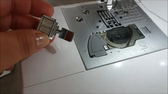 Tiene la entrada de la aguja estrecha y por debajo lleva dos ranuras una a la derecha y otra a la izquierda para coser la cremallera metiendo los dientes por esas ranuras