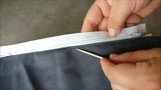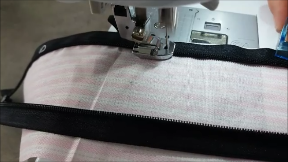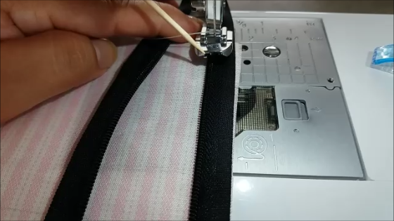 es decir, si coses la cremallera por la izquierda, metes los dientes por la ranura izquierda y el lado derecho del prensatelas debe quedar pisando la banda textil de la cremallera, y lo mismo si la coses por la derecha.