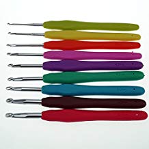 Ergonómicos: son aquellos que tienen una goma en la parte superior del mango, en la agarradera que los hace más cómodos. Este tipo de ganchos son muy importante para evitar lesiones en las muñecas y codos sobre todo cuando el gancho es muy pequeño, inferior a 3mm. En estos casos, el mango nos permitirá tener mejor sujeta la aguja sin tener que manejar piezas de menos de 3mm de diámetro. Por contra, he de confesar que cuando se teje con este tipo de ganchos hilos que tienen un grosor por encime de 6mm me resulta un poco incómodo ya que, en ocasiones, la labor se queda “pegada” a la goma del gancho y no escurre bien. Podéis encontrarlos en pack en amazon o puntos de fantasía a precio económico. Si preferís invertir en ganchillo de calidad, knit pro es la marca por excelencia en ergonómicos.