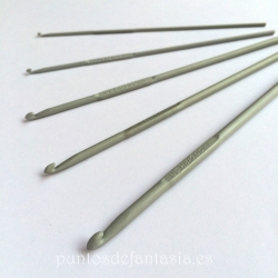 Plástico: los ganchos de plástico son especialmente prácticos para números elevados (a partir del 8) porque consiguen una aguja de bastante ligereza para su tamaño. Puedes encontrar ganchos de plástico bastante económicos pero hay que tener cuidado con ellos ya que se pueden romper con facilidad si se caen al suelo por accidente.