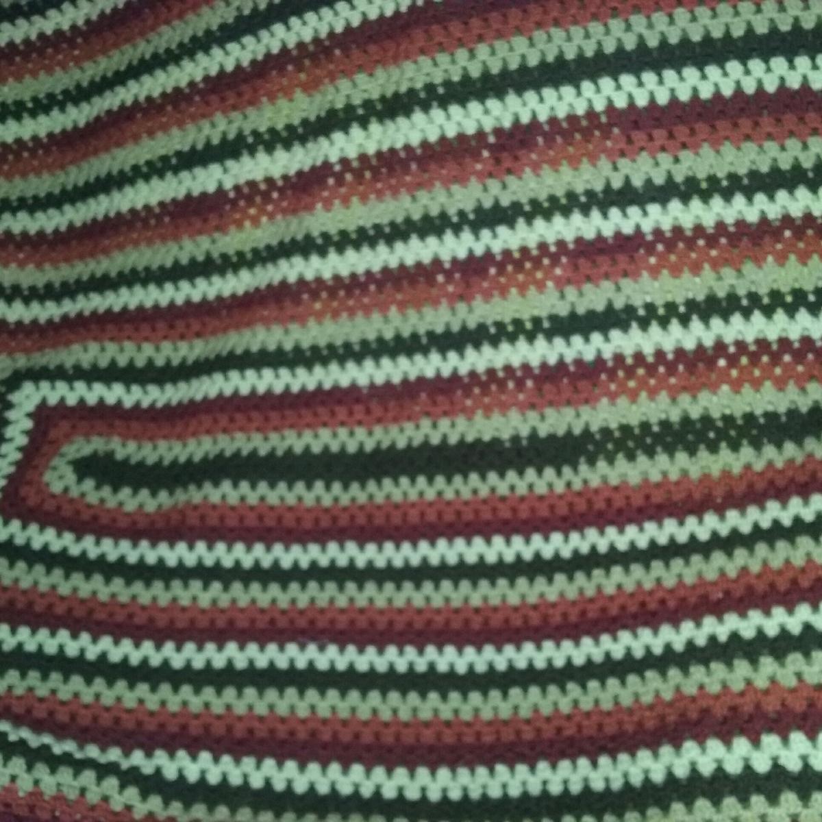 Está tejida a ganchillo, con varetas. Mi madre se la hizo a mi hermana, y cuando la ví terminada no pude evitar prendarme de ella… y a comprar lana. A parte de su simpleza, lo que más me gustan son los colores cálidos que tiene, me encanta la gama de los tonos tierra, y es que da la sensación hasta de que abriga más con esos tonos.