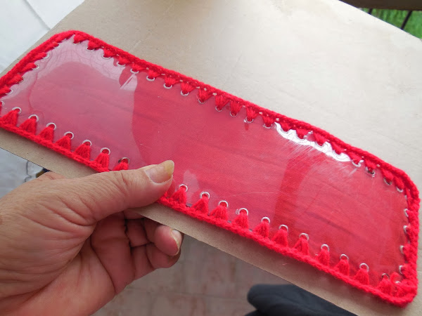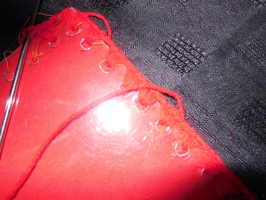 BUENO CONTINUAMOS CON EL BOLSO, AQUI LE TEJO UN MEDIO PUNTO EN CROCHET CON LANA, INSERTANDO TRES VECES EN EL MISMO ORIFICIO, LUEGO PASO AL OTRO Y ASI TODO EL CONTORNO, CON TODOS LOS CUADRADOS HAGO LO MISMO, PASANDO DE LADO A LADO POR LOS AGUJEROS Y LA TELA.