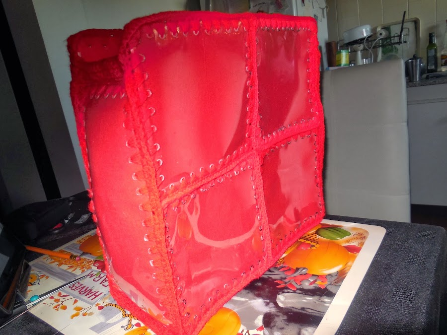 BUENO ESTE ES EL BOLSO TODO UNIDO, EN LOS LATERALES TERMINE EL ULTIMO TRAMO CON UNAS VUELTAS EN CROCHET EN MEDIO PUNTO