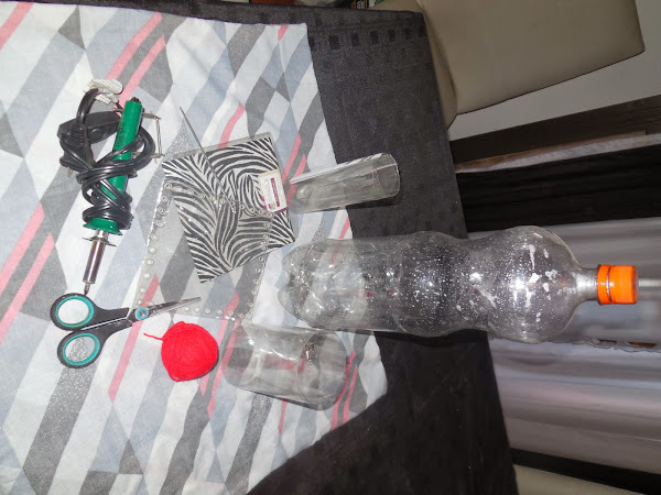 MATERIALES QUE NECESITAMOS, BOTELLAS DE REFRESCOS O GACEOSAS O SODAS, DE PLASTICO, TELA, LANA O HILO, TIJERA, AGUJA DE CROCHET, PIROGRABADORA O CUALQUIER ELEMENTO QUE PODAMOS CALENTAR PARA AGUJEREAR EL PLASTICO