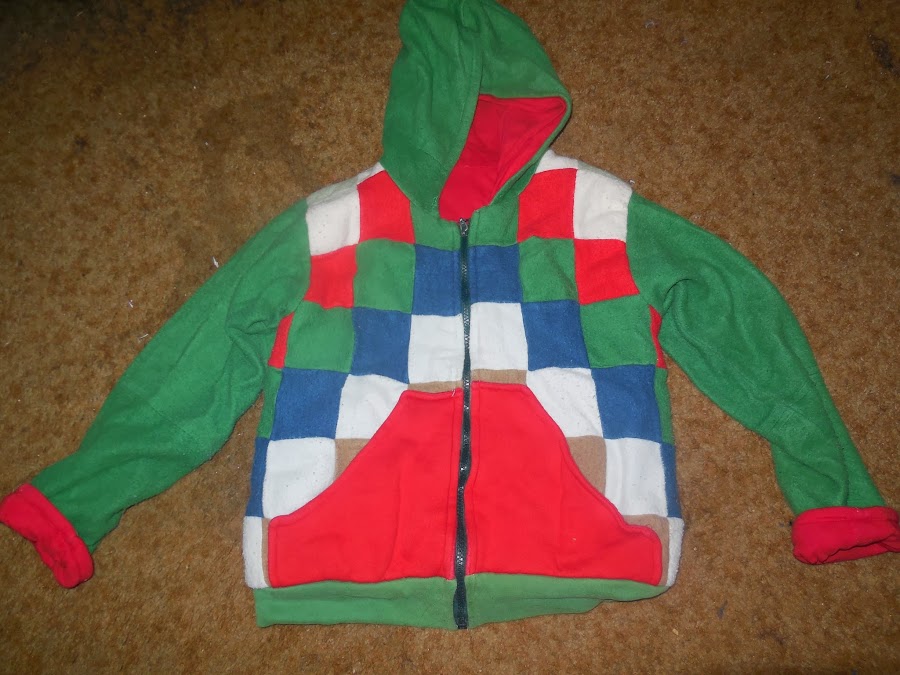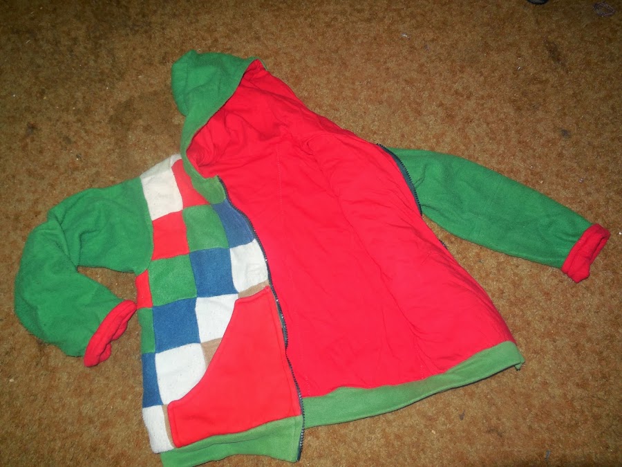 PARTE DE ATRAS DE LA CAMPERA, LA CAPUCHA, LAS MANGAS Y LA CINTURA ESTAN REALIZADAS DEL MISMO COLOR Y SIN GUATA INTERMEDIA, EL CUERPO ESTA HECHO CON CUADRADOS DE POLAR DE 8 CM DE LADO UNIDOS USANDO TECNICA DE PATCHWORK