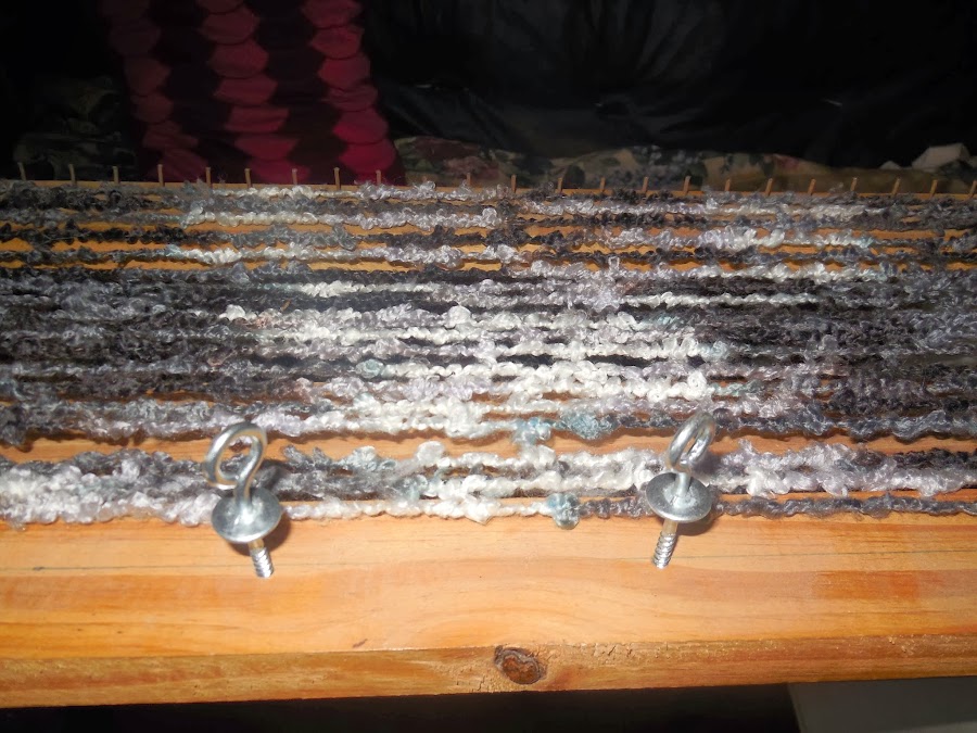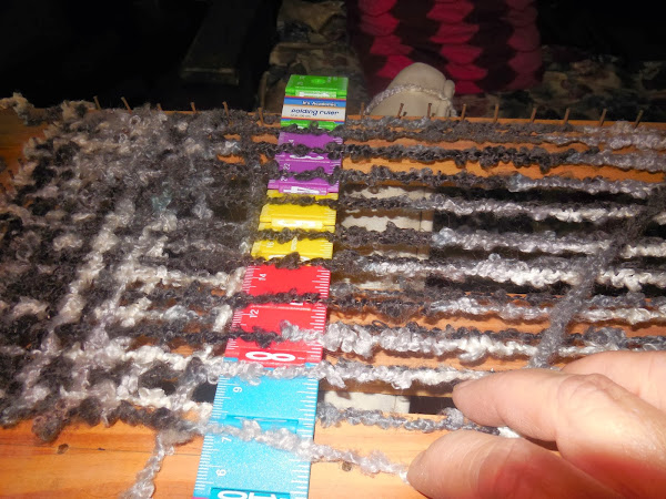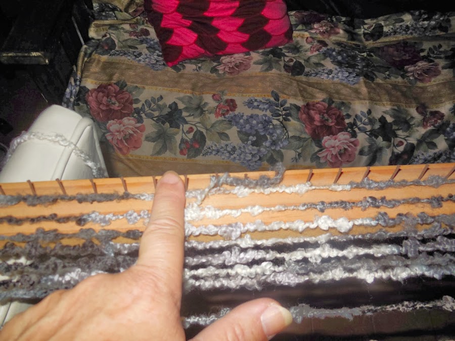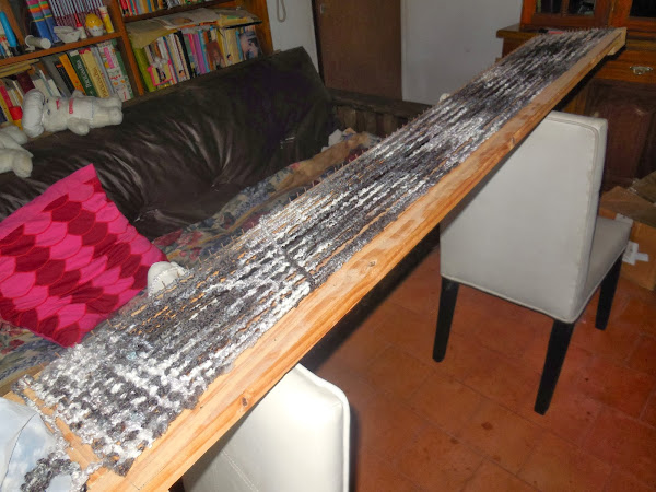EN LA CARA OPUESTA HACER UNOS AGUJEROS PARA COLOCAR CLAVOS O TORNILLOS QUE NO DEJARAN QUE SE DEFORME EL TEJIDO, ESTOS AGUJEROS TENDRAN UNOS 10 CM ENTRE UNO Y OTRO, Y LOS CLAVOS O TORNILLOS SE COLOCAN EN EL MOMENTO DE REALIZAR EL TEJIDO UNA VES TERMINADA LA BUFANDA SE RETIRAN PARA PODER RETIRAR EL TRABAJO.
