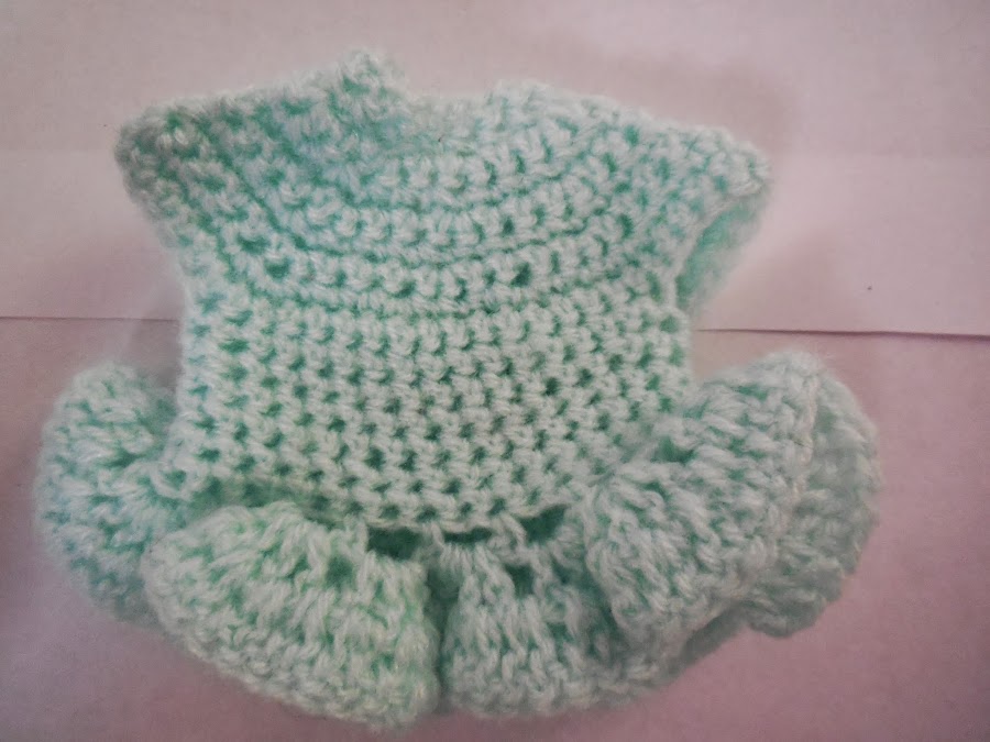 TAPADOS EN ROSA Y VERDE REALIZADOS EN PUNTO BARETA O PUNTO ALTO, CON PUNTO ABANICO EN LOS BORDES, CAPITA CON CAPUCHA EN BARETA O PUNTO ALTO Y REMERA EN PUNTO ALTO CON VOLADO EN ABANICO.