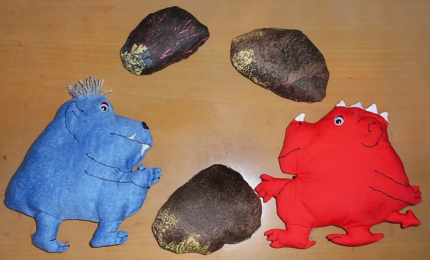 Yo empecé a buscar en mis archivos, pues quería trabajarlo con mis alumnos de una manera divertida, y encontré un libro que se titula ?Los dos monstruos? de David Mckee (aquí tenéis un enlace a la historia y los dibujos originales). Este cuento lo había trabajado en otras ocasiones, pero ahora quería hacer algo diferente. Así que me decidí a hacer los muñecos y el decorado, todo en tela, con los detalles bordados y con piezas que se montan y desmontan para poder contar el cuento.