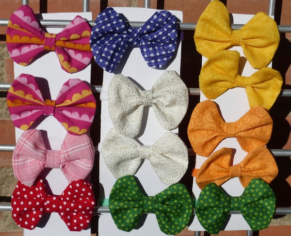 El otro día buscando materiales entre las cosas de mi madre encontré el patrón para hacer los lazos, y aunque yo no tengo niñas para ponérselos, decidí hacer esta colección de simpáticos coleteros, ya que seguro que a alguien le gustan y además me apetecía un montón volverlos a hacer.