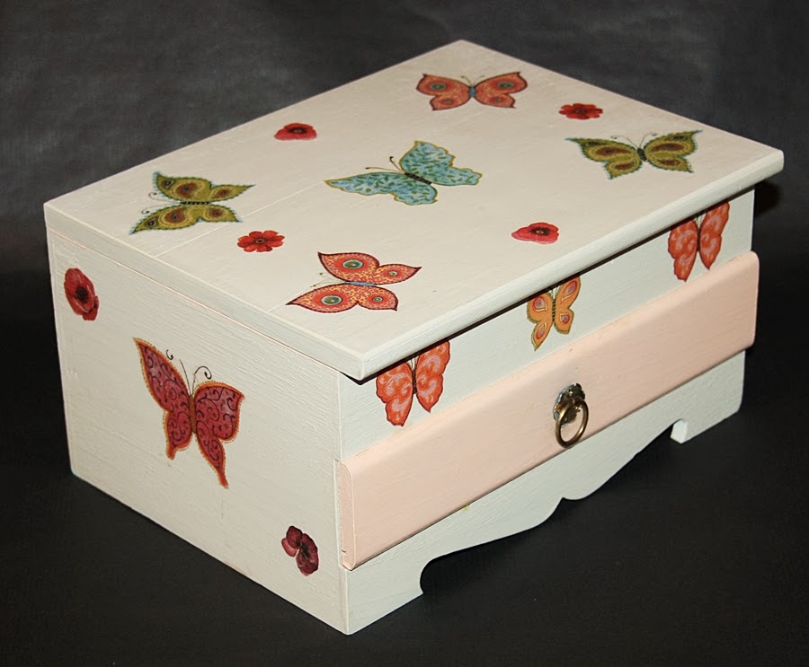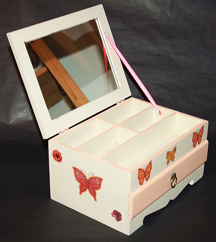 La caja está pintada en blanco natural y con el cajón y algunos detalles del interior en rosa palo. Para decorarla un montón de mariposas y flores puestas con la técnica del decoupage. La verdad que ha quedado una pieza muy alegre para llenarla de esas pulseras, collares y anillos que tanto nos gustan y que siempre queremos tener a mano.