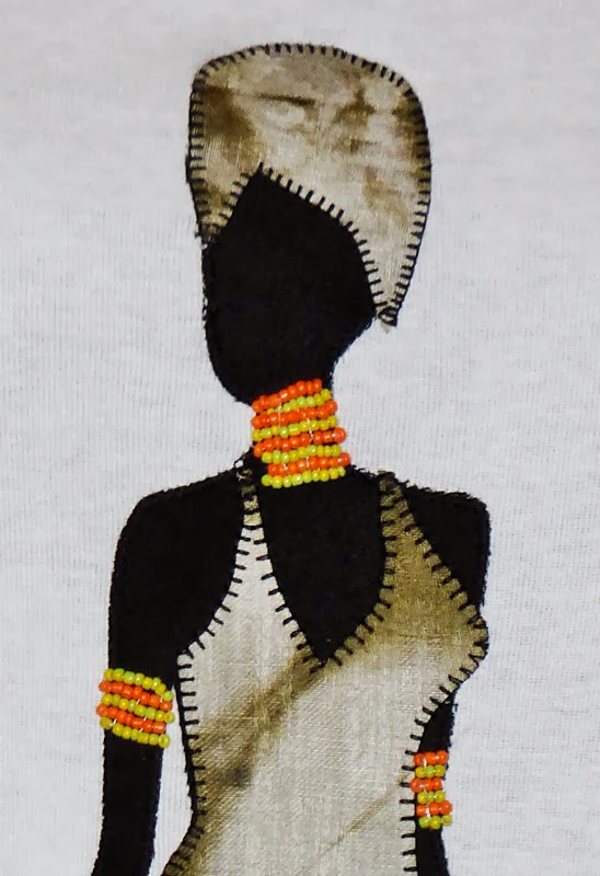 En esta camiseta, queda una africana muy elegante y los abalorios los he puesto en colores que destacan sobre el cuerpo negro azabache.