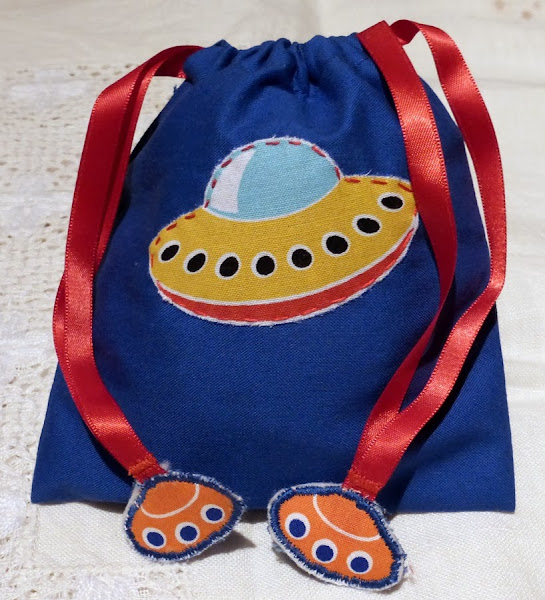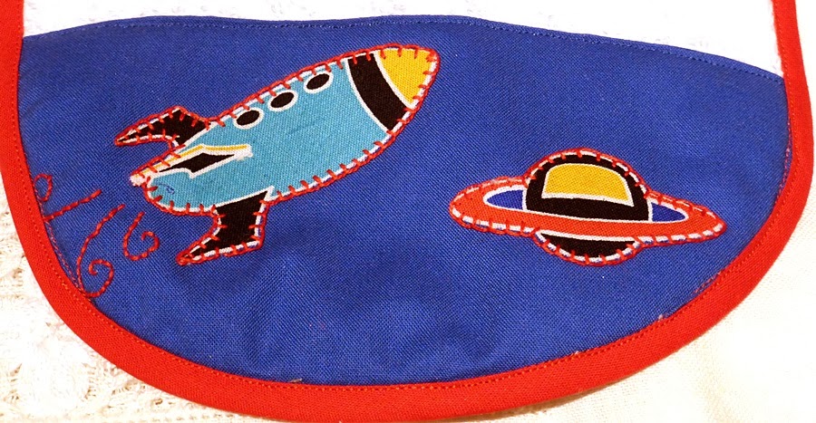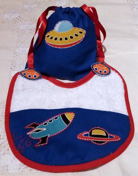 Así que me puse manos a la obra y saque un babero y una bolsita para el chupete. La decoración espacial, con platillos voladores y cohetes, y los tonos alegres y divertidos como a mí me gustan: rojos, azules y naranjas.