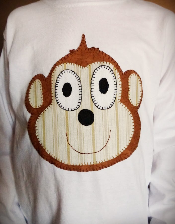 El está muy orgulloso de que su mamá cosa y se lo cuenta a todo el mundo así que decidí hacerle una cosita. Su animal favorito es el mono y le encanta todo lo que lleve monitos, así que le he hecho una camiseta con un simio de lo más simpático. Le ha encantado, a pesar de que no le gusta mucho que le regalen ropa.