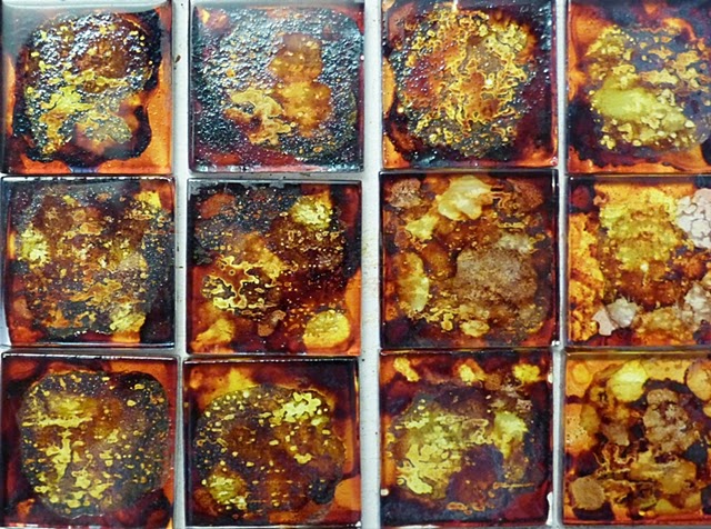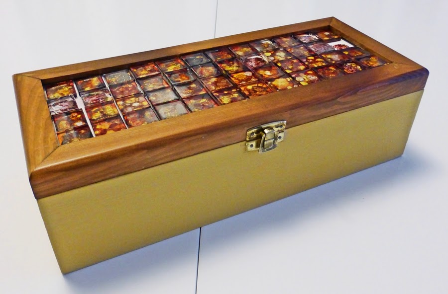La mitad de esta pieza está teñida en color de madera oscura y la otra mitad está pintada en color mostaza, lo cual hace una combinación muy elegante, pero lo que lleva más trabajo son los cristalitos que adornan la parte de arriba de la caja ya que están pintados uno a uno, utilizando tres tonos de pintura en marrones y ocres. Aunque la verdad es que el trabajo mereció la pena porque en conjunto queda muy bonito.