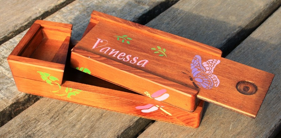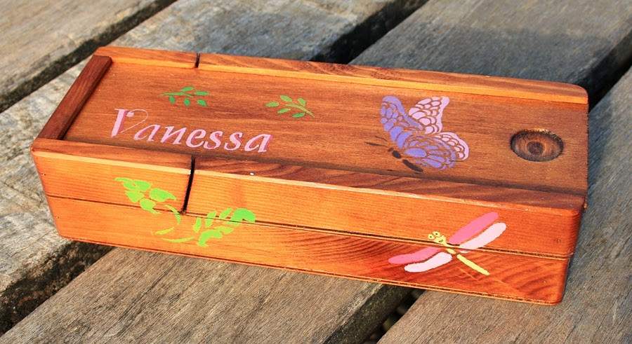 Teñí la madera del plumier de un color avellana, después puse su nombre y por último lo fui decorando con mariposas y unas plantitas verdes. Para terminar tres manos de barniz de madera y listo.