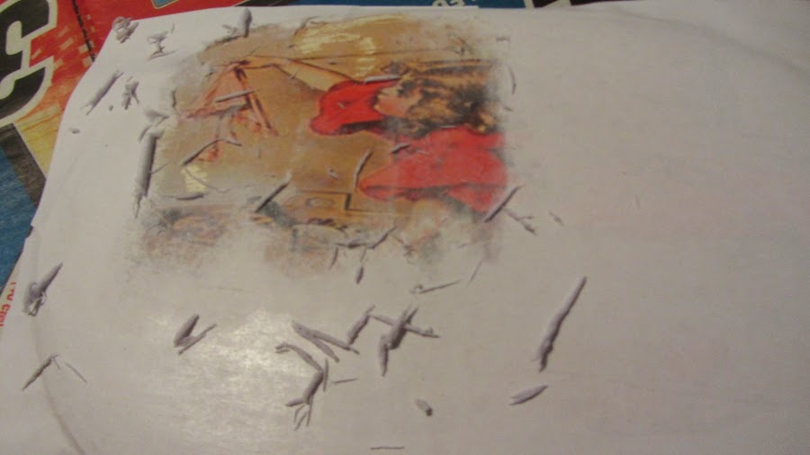 Llegó el momento de la verdad... humedecer y quitar papel... al principio muy bien, luego había sitios donde el dibujo se venía con el papel... no sé si debí impregnar también el papel por la parte de la foto con Phototransfer o mojarme más el dedo.