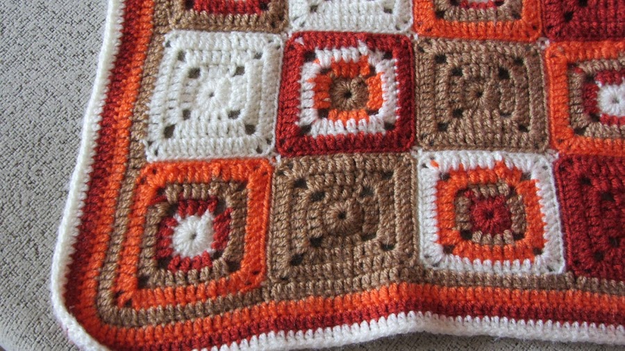 Esta hecha de cuadros de un solo color mezclados con cuadros con los cuatro colores, alrededor de la manta una cenefa con los colores de la manta.