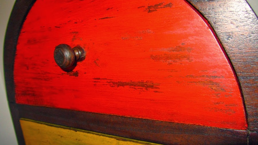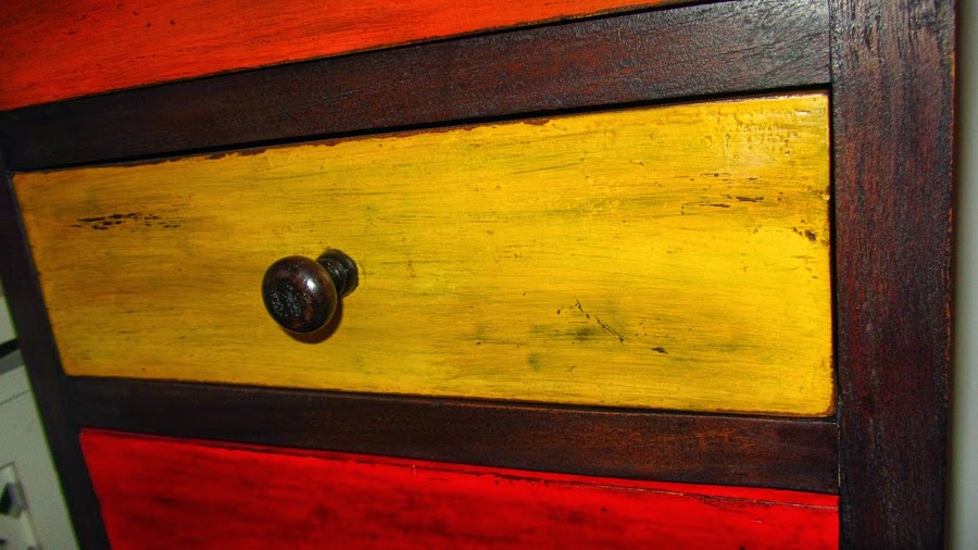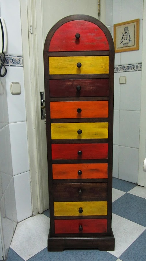 Quería que fuera algo más alegre que el color oscuro que tenía así que decidimos pintar los frontales de los cajones de diferentes colores... amarillo, naranja, rojo y burdeos, el resto del cajón y el armazón quedaron de tinte nogal.