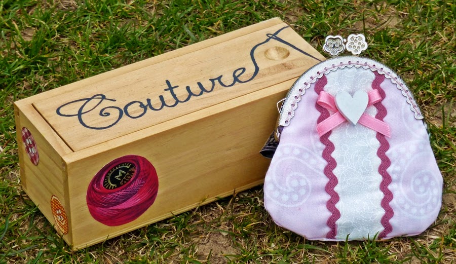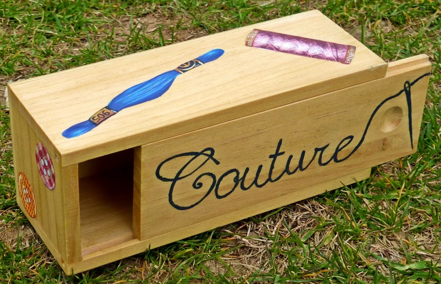En la caja puse ?couture?, costura en francés, ya que como dice el anuncio el francés es para las cosas pequeñas y delicadas; y los lados los adorne con motivos relacionados con los hilos y las labores con la técnica del decoupage.