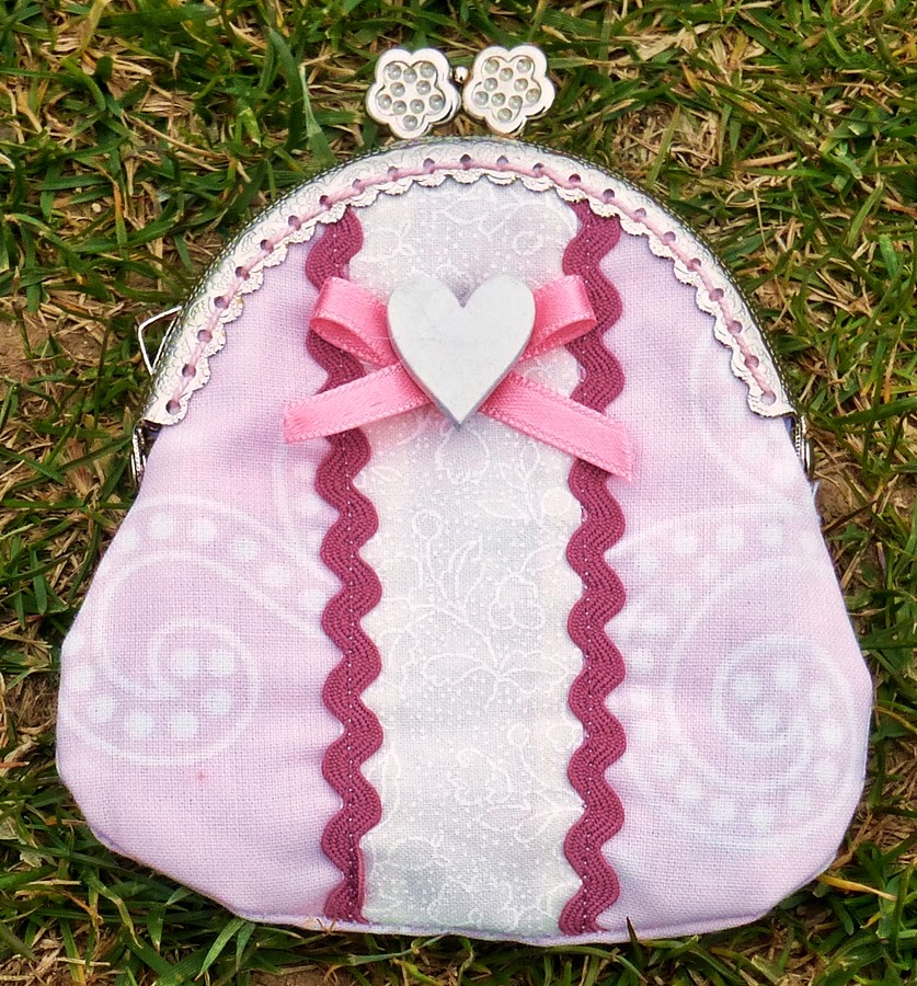 Y el monedero rosa, ¡pero muy rosa! He de reconocer que no es de mis colores favoritos pero el resultado quedó muy bonito. Elegí dos telas, una en rosa y otra en blanco y las uní con piculina de un tono más intenso. En medio coloqué un lacito con un corazón en blanco pintado a mano. Todo muy dulce.